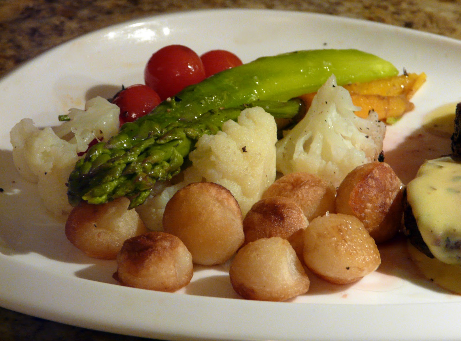 Parisienne Potatoes, Cauliflower, Asparagus, tiny carrots (Moe’s plate only) and sauteed cherry tomatoes.