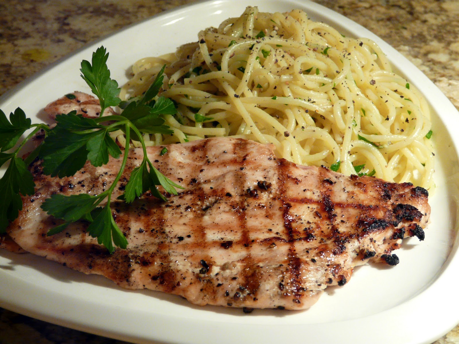 Pound boneless chicken breasts flat and rub with fresh garlic ( Note: Rub garlic on microplane to make a paste), salt, pepper and the juice of a whole lemon. (You can also rub chicken with a little Dijon Mustard)