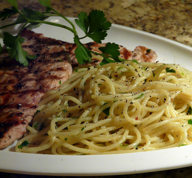 Drain pasta and add to pan. Toss to coat with oil and sprinkle with fresh ground black pepper and chopped parsley. Serve as a side with Veal Piccata, Breaded Chicken breasts or Italian Roasted Chicken.