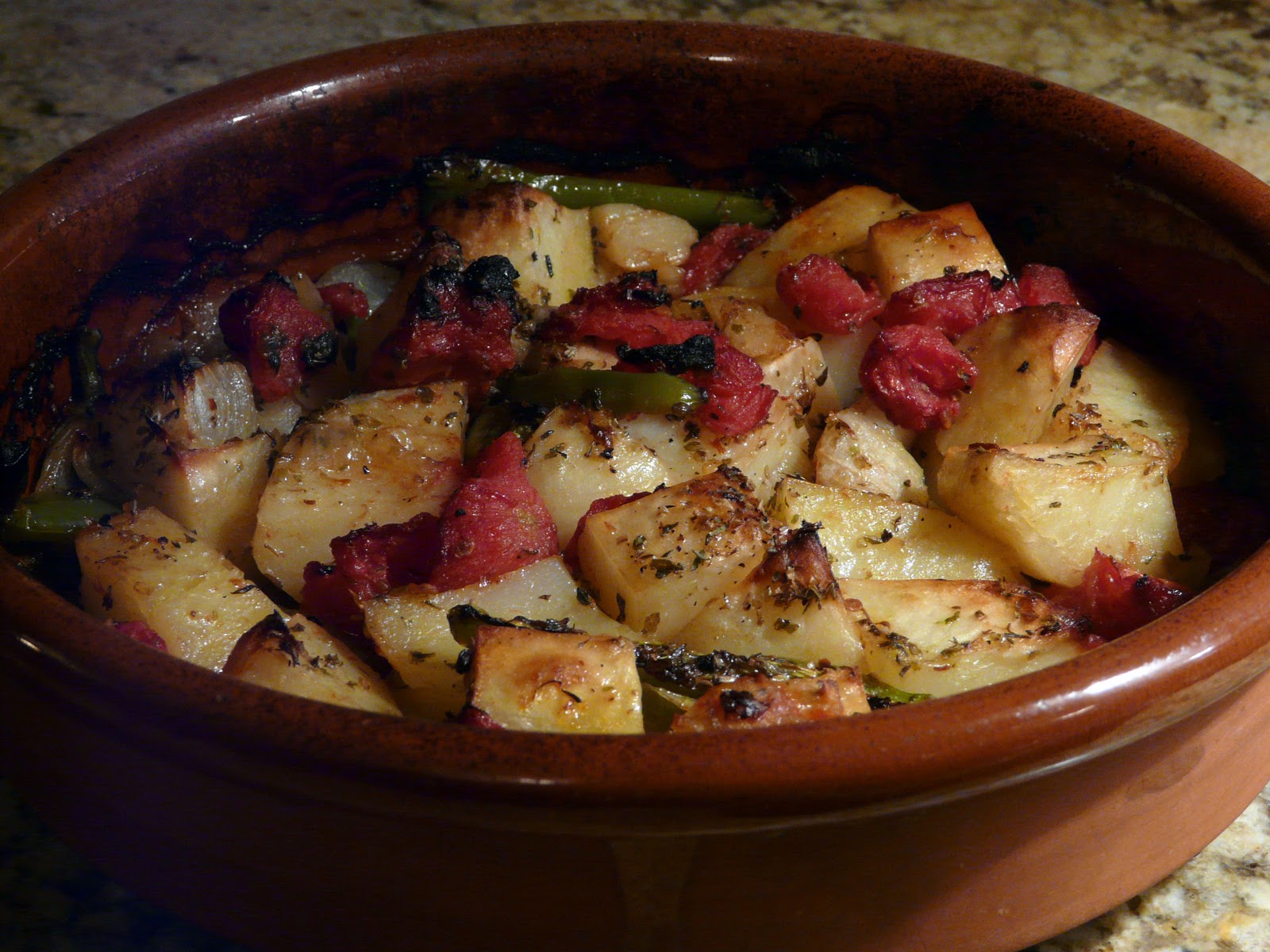 Drizzle with olive oil (be generous) and place in your pre-heated oven for 45-50 minutes or until potato-tops are crisp but there’s still some sauce in the dish.