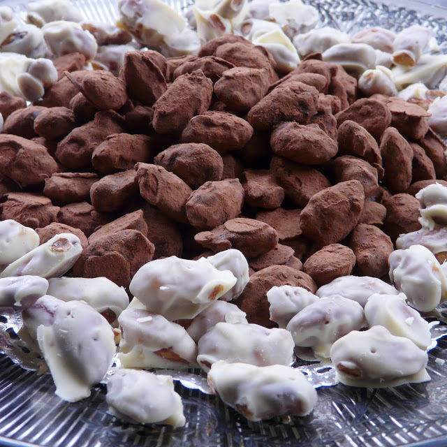 4) Stir the almonds into the bowl of melted chocolate, making sure that every piece of almond is covered with chocolate. Spread out onto the baking tray again, and then keep in the fridge until the chocolate hardened.