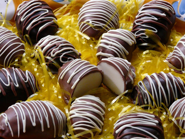 Melt chocolate. Dip each egg into melted chocolate, and place on tray lined with parchment or wax paper.
