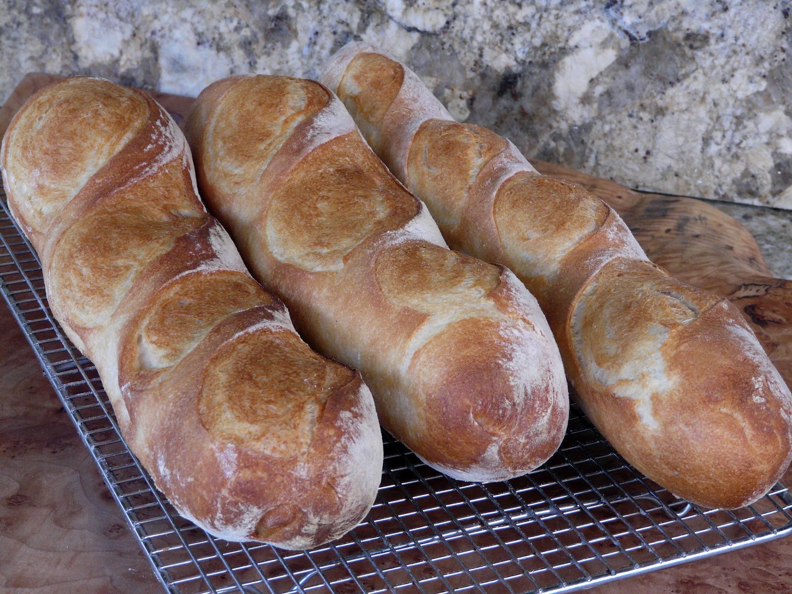 Me too Linda.Monique, I don't use a pan to hold the loaves. I use a handwoven linen tea towel as a \”baker's Couche\”. I have a second handwoven linen towel that I use to cover the loaves as they rise. But you can also buy a Baker's Couche. The towel is heavily floured and the loaves are placed in the folds and left to rise. The cookie sheet that I place the towel on has one lip which supports the first loaf and I place my French rolling pin under the towel to support the last loaf.When the bread is ready to go into the oven, I just roll the loaf onto to the paddle, slash and slide it on to the stone.A cold rise is good Monique. I reduce the amount of yeast just so I will have a slower rise. I think a slower rise helps develop the flavour.~Ann