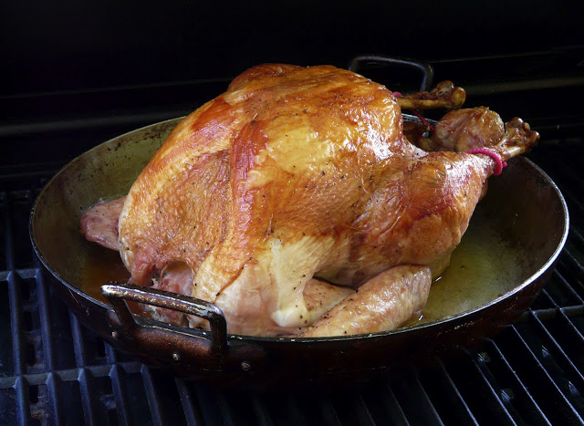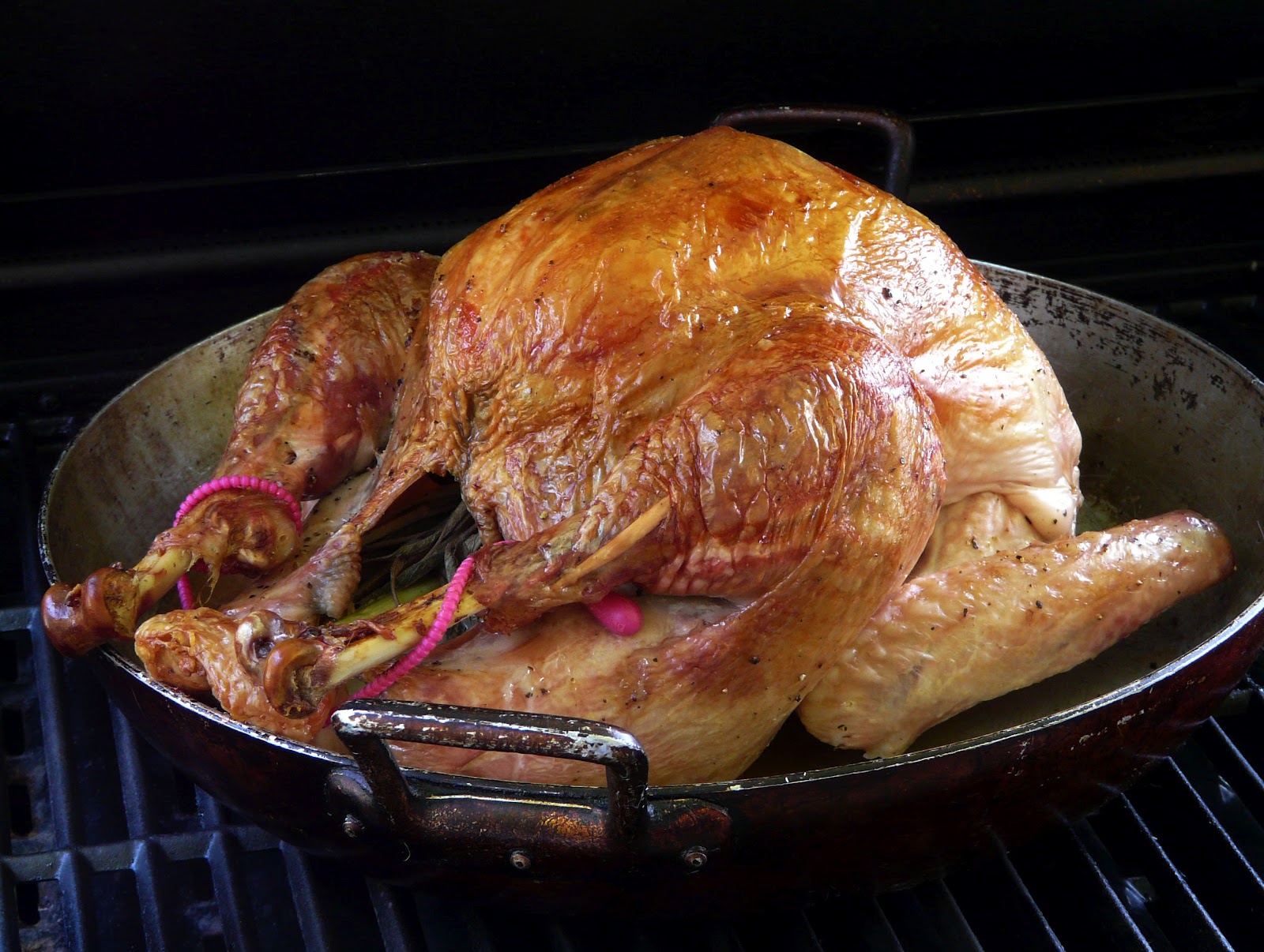 You could roast the turkey either on the spit or directly on the grill, but I placed the turkey in a shallow roasting pan so I would have drippings to make gravy.