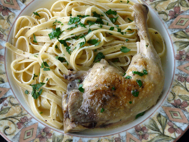 Chop a young chicken into pieces at the joints. Saute it with 2 tablespoons butter and 1 of oil, season it with salt and pepper, and a pinch of nutmeg. Once the pieces are browned on all sides, drain off the fat, dust the meat with flour, add a minced clove or two of garlic, and add 1/2 cup of dry white wine. Add about 1/2 cup of broth over the chicken to keep it from drying out, cover it, and simmer it until done. Before serving it, sprinkle it with minced parsley and squeeze half a lemon over it.