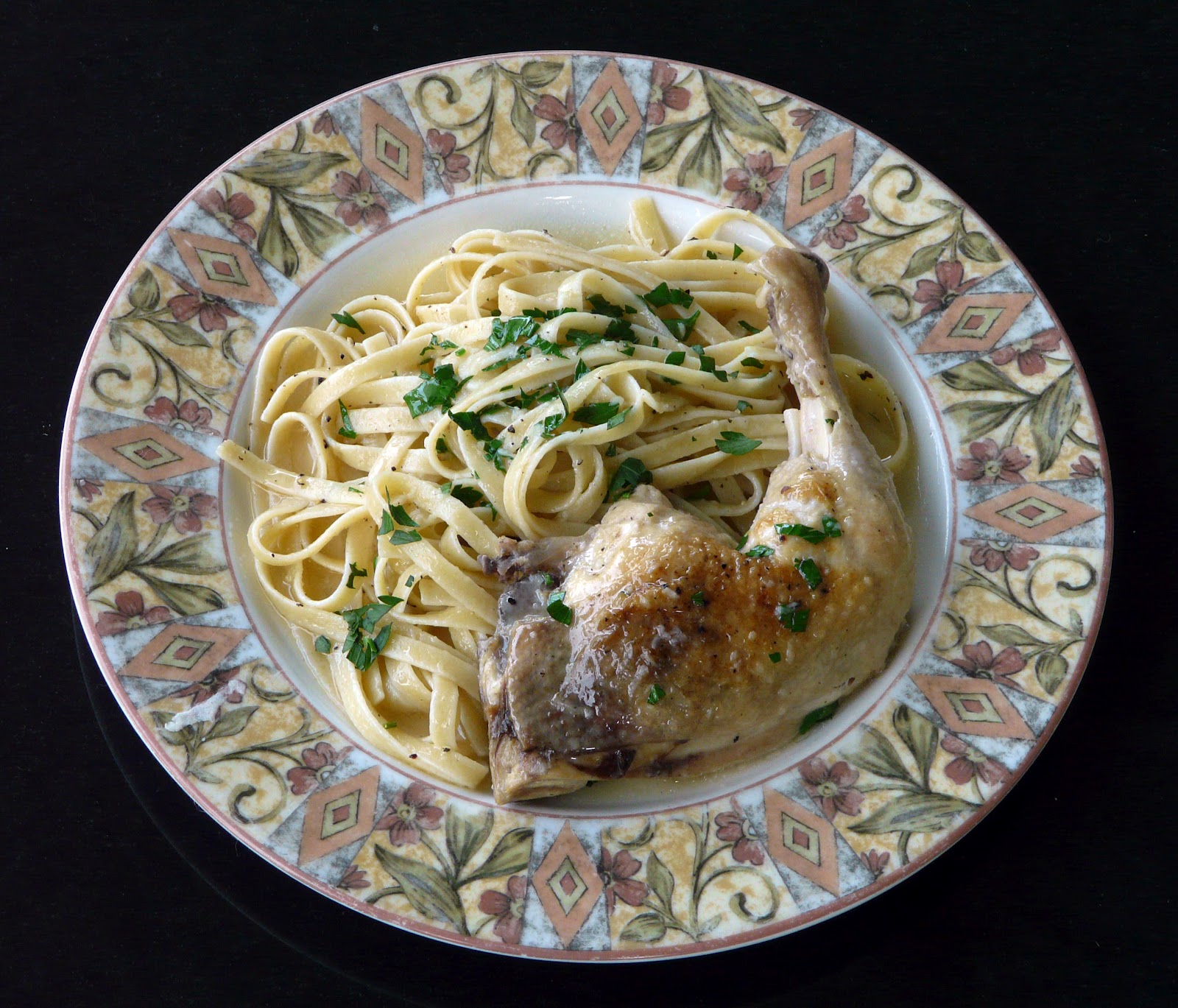 Original Recipe: Take a young chicken, remove the neck and legs and cut into large pieces at the joints. Saute in 30 grams (about 1 ounce) of butter and one tablespoon of olive oil, seasoning with salt, pepper, and a dash of netmeg. When the pieces have browned on both sides, skin the fat and add a level tablespoon of flour and a deciliter (about 7 fluid ounces) of wine. Add broth and cover, cooking over low heat until done. Before removing from the fire, garnish with a pinch of chopped parsley; arrange on a serving dish and squeeze half a lemon over it. The result is an appetizing dish.