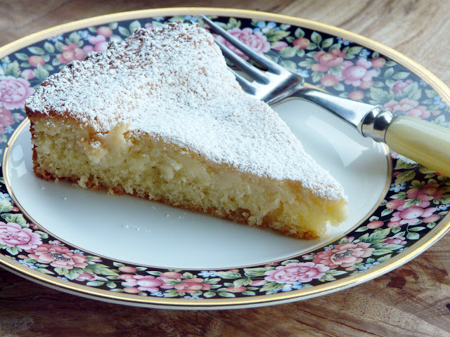 Dust the cake top with a sprinkling of confectioners’ sugar. Berries would be good with this, but are optional.