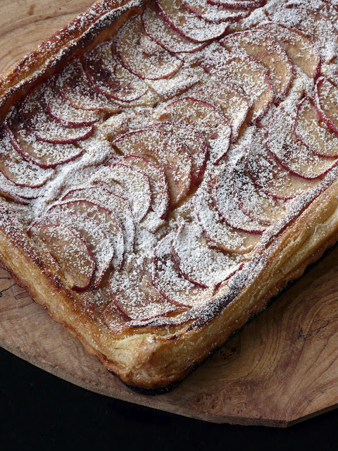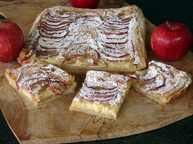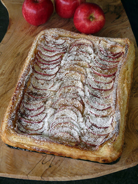 Place flour and salt into heavy duty mixer with paddle blade. (I use a KitchenAid). Add cubes of butter and mix just enough for the paddle to slightly flatten the butter cubes. Do not break up butter into smaller pieces. Add enough ice water to moisten. Turn out on to floured surface. Will look very shaggy and the butter pieces will be visible. Pat and push mixture into rectangle and using a pastry scraper, flip bottom of pastry over the middle and then the top over to cover. (Like a business letter). Turn so that the fold is on your left hand side. Roll pastry out to a 12 to 14 inch rectangle. Fold again. Turn and roll out again. Do this “fold and turn” four times. Wrap in plastic wrap and refrigerate for an hour or longer. Remove from fridge and roll out and turn two more times. Pastry is now ready to use. If not using right away, refrigerate or freeze.
