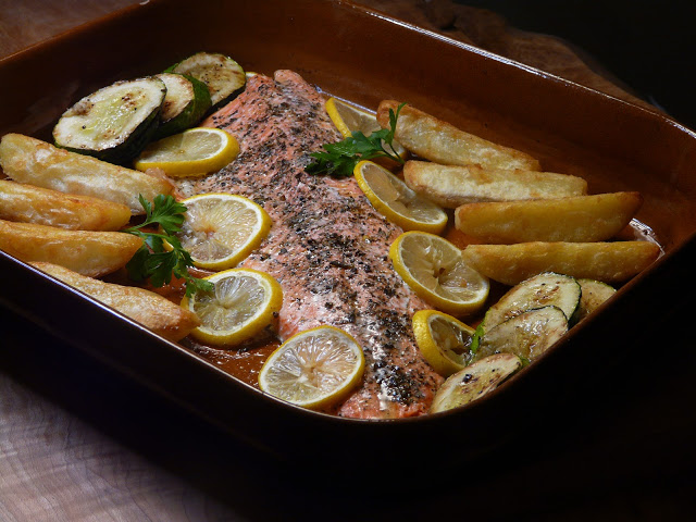 the fish went into the oven.