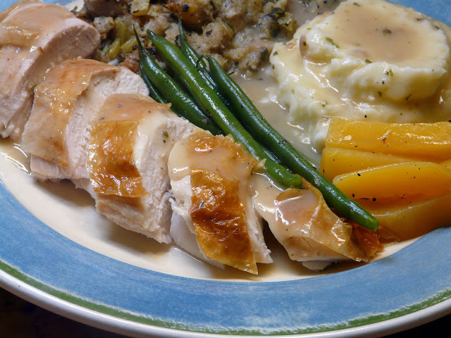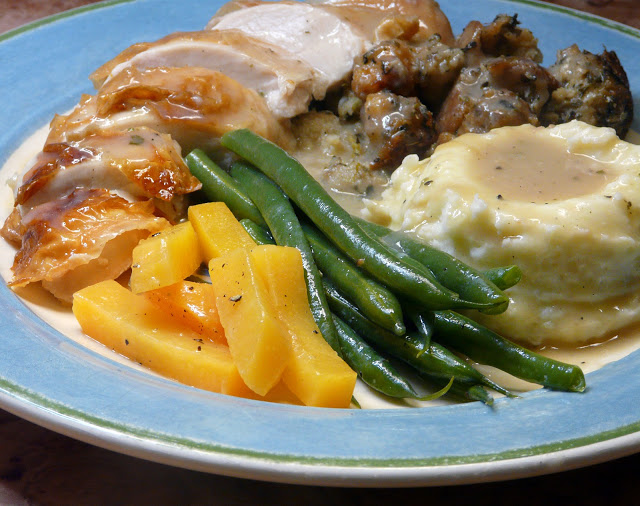 The vegetables, ( Potatoes, Green Beans and Rutabaga) cooked while the bird rested.