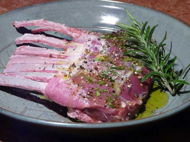 Rubbed with fresh garlic, fresh rosemary, salt and lots of coarsely ground black peppercorns.