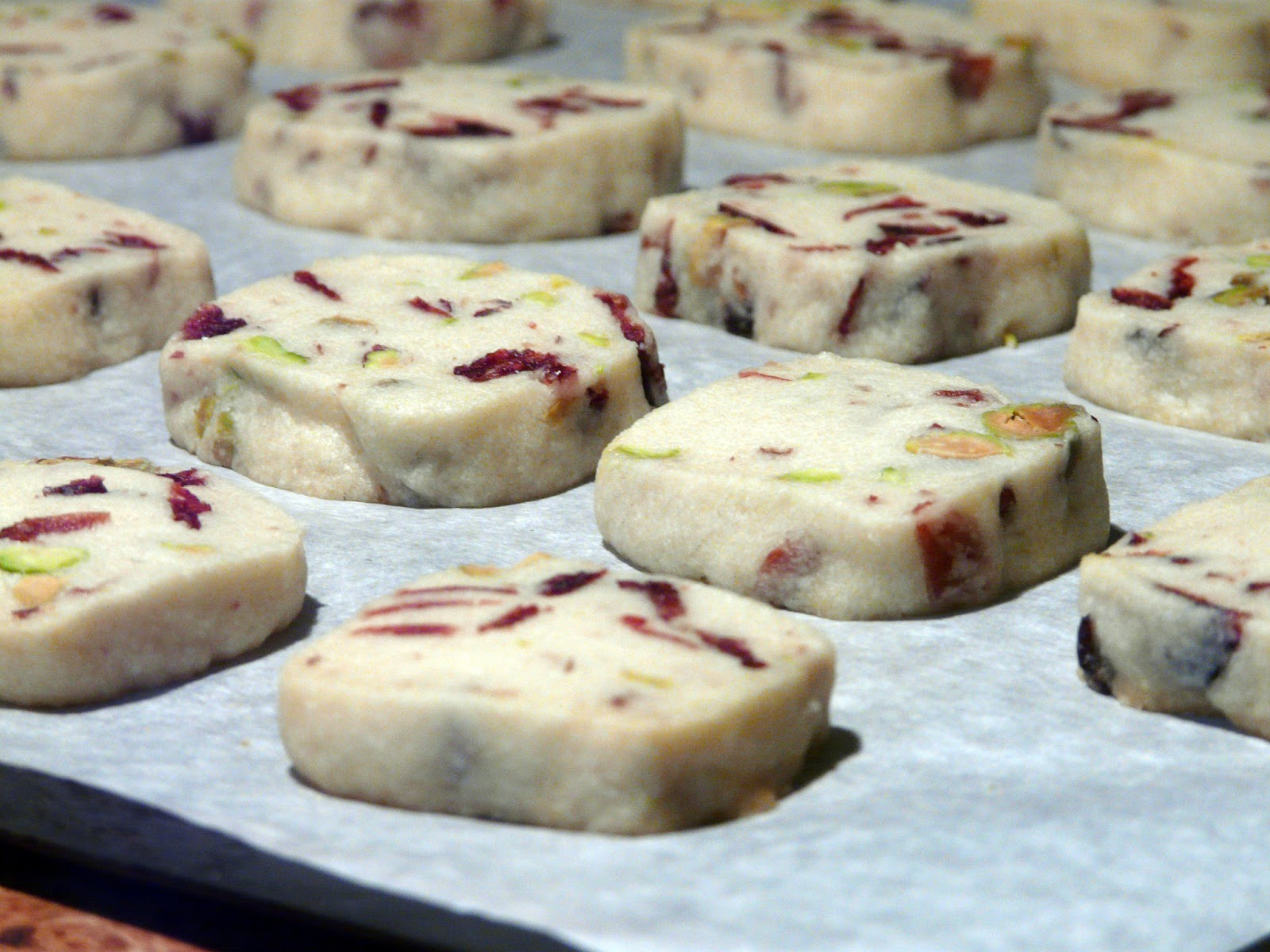 In the bowl of your electric mixer (or with a hand mixer), beat the butter until smooth (about 1 – 2 minutes). Add the sugar and beat until smooth and creamy (about 3 minutes). Beat in the vanilla extract. Gently stir in the flour mixture just until incorporated. Fold in the chopped pistachios and dried cranberries. (Make sure that the nuts and cranberries are evenly distributed throughout the dough.)