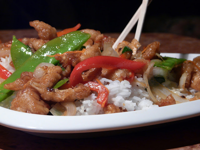Remove chicken from marinade and toss in corn starch, coating well (a few at a time). Cook in wok, tossing until golden brown. Add more oil as needed. Continue until all chicken is cooked. Wipe Wok clean with paper towel. Add a little more oil and saute the onions, red pepper and snow peas. Add ginger and garlic. Cook for just a minute or two. Add the sauce, a few tablespoons of chicken broth and simmer until sauce starts to thicken. Add the chicken, chopped green onion (carrots if using) toss well and serve over rice.