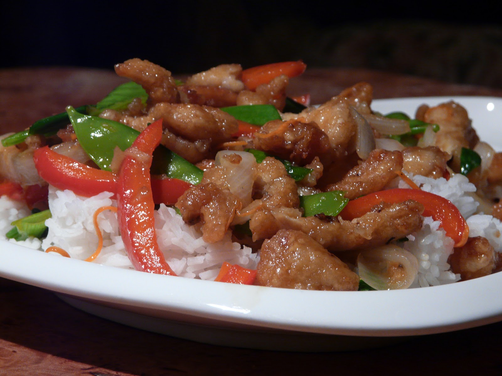 Remove chicken from marinade and toss in corn starch, coating well (a few at a time). Cook in wok, tossing until golden brown. Add more oil as needed. Continue until all chicken is cooked. Wipe Wok clean with paper towel. Add a little more oil and saute the onions, red pepper and snow peas. Add ginger and garlic. Cook for just a minute or two. Add the sauce, a few tablespoons of chicken broth and simmer until sauce starts to thicken. Add the chicken, chopped green onion (carrots if using) toss well and serve over rice.