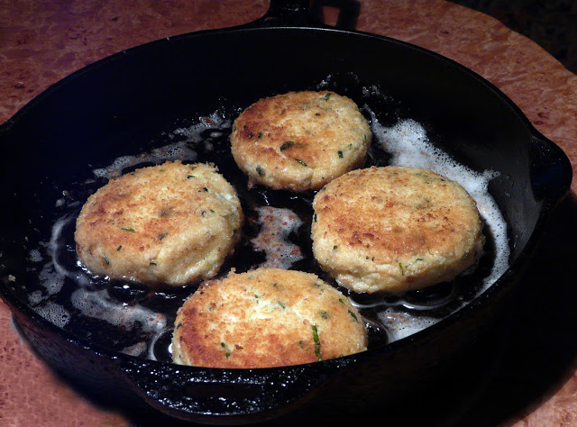 Form patties and dredge in fresh grated bread crumbs. Heat skillet (I used a vintage cast iron pan), add a little oil and butter and cook fish cakes until golden brown.