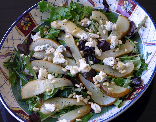 Warm Pear (Bosc) and Gorgonzola Salad with toasted Pine nuts.