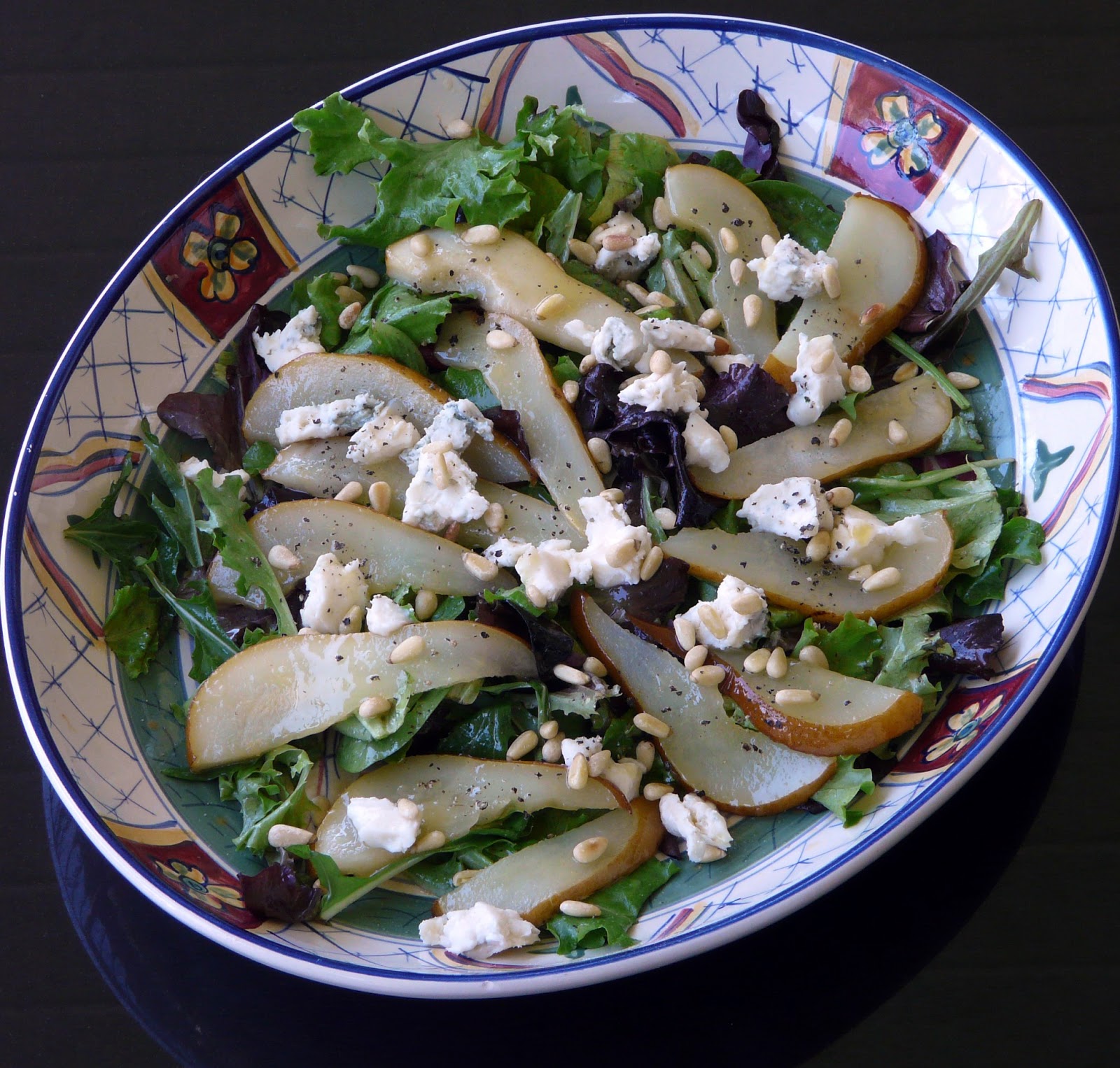 Warm Pear (Bosc) and Gorgonzola Salad with toasted Pine nuts.