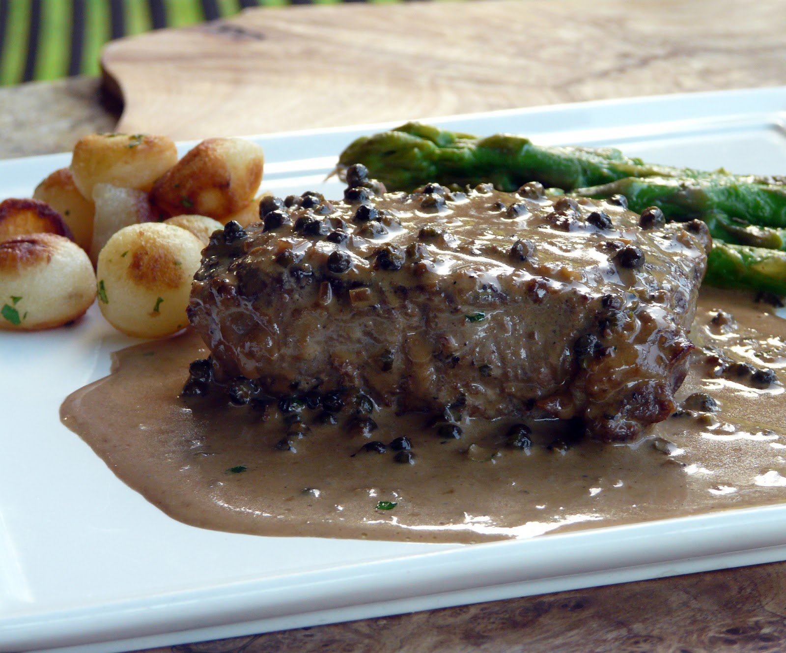 Basted with peppercorn sauce and served with Parisienne Potatoes and fresh steamed asparagus.