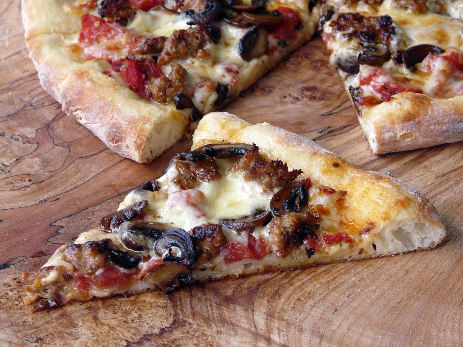 Topped with sauce, cheese, sauteed Italian sausage and mushrooms.