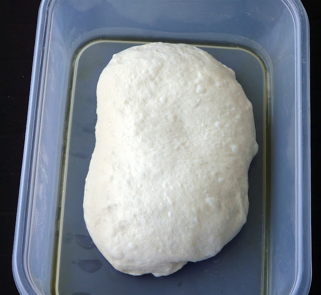 It was left it on the kitchen counter to come to room temperature (about two hours) and then divided in half, and one half was used to make a pizza and the remaining dough went back into the fridge.