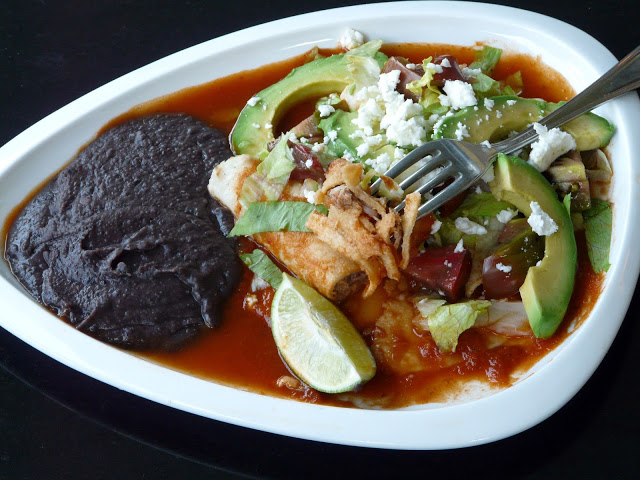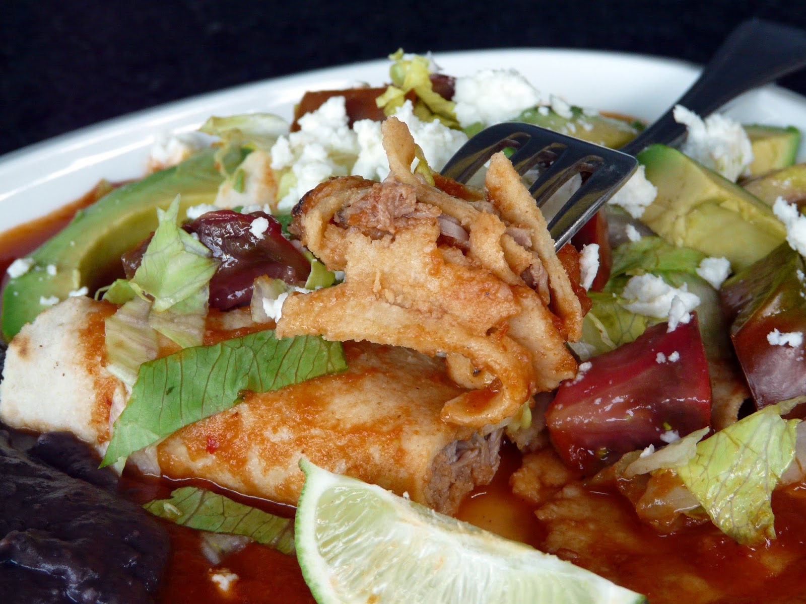 I like how they serve their enchiladas topped with a wonderful light sauce, garnished with lettuce, tomatoes, avocados, etc…