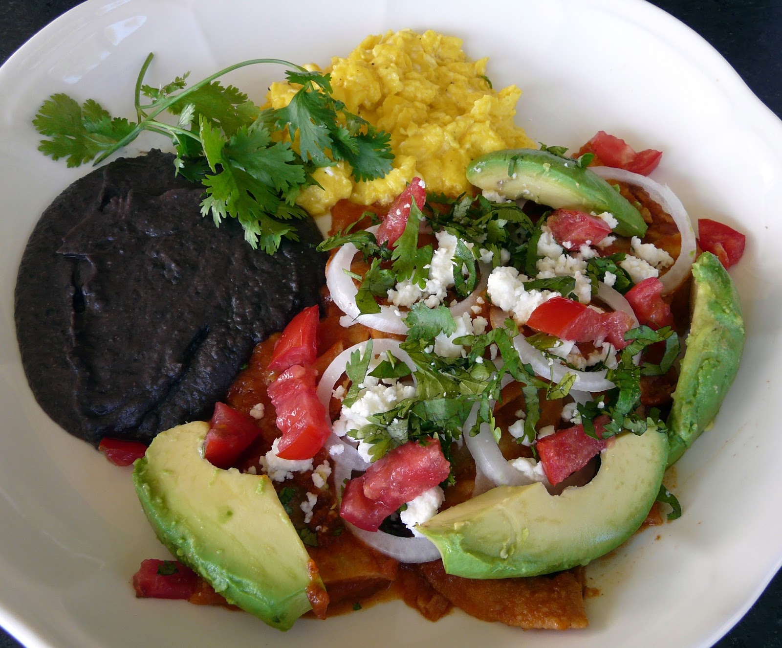 Tossed them with the leftover enchiladas sauce and made Moe Chilaquiles for breakfast. Served with scrambled eggs and refried beans.