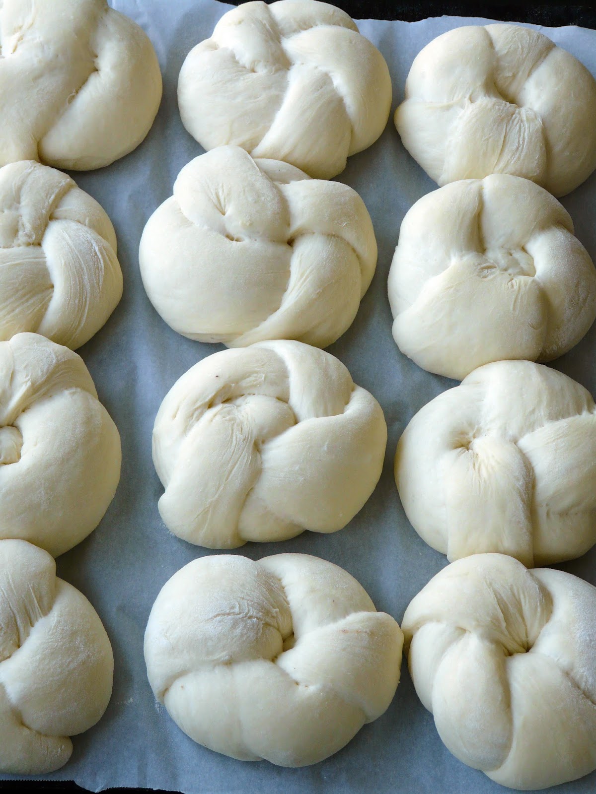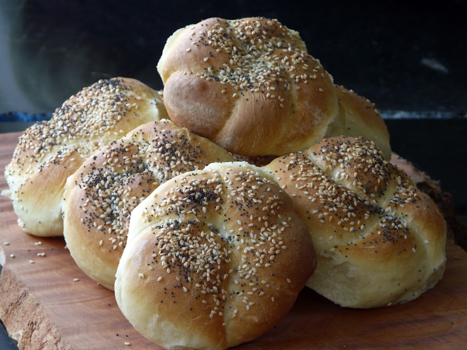 Tip dough on to floured surface. Shape into a log and cut into 4 oz pieces. Should net 12 rolls. Shape pieces into logs and let rest, covered for ten minutes. Roll dough between hands, or on board to make a rope. Tie a loose knot in the middle of the rope and then tuck one end under and up the middle and the other end down the middle. Place on parchment covered baking sheet. When all the dough has been shaped , cover and allow to rise until double. About one hour. While rolls are rising, preheat oven to 450°F. When rolls are ready to bake, spray with water and sprinkle with poppy seeds and/or sesame seeds. Bake for 20 to 25 minutes until rolls are golden brown.