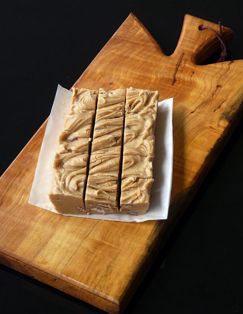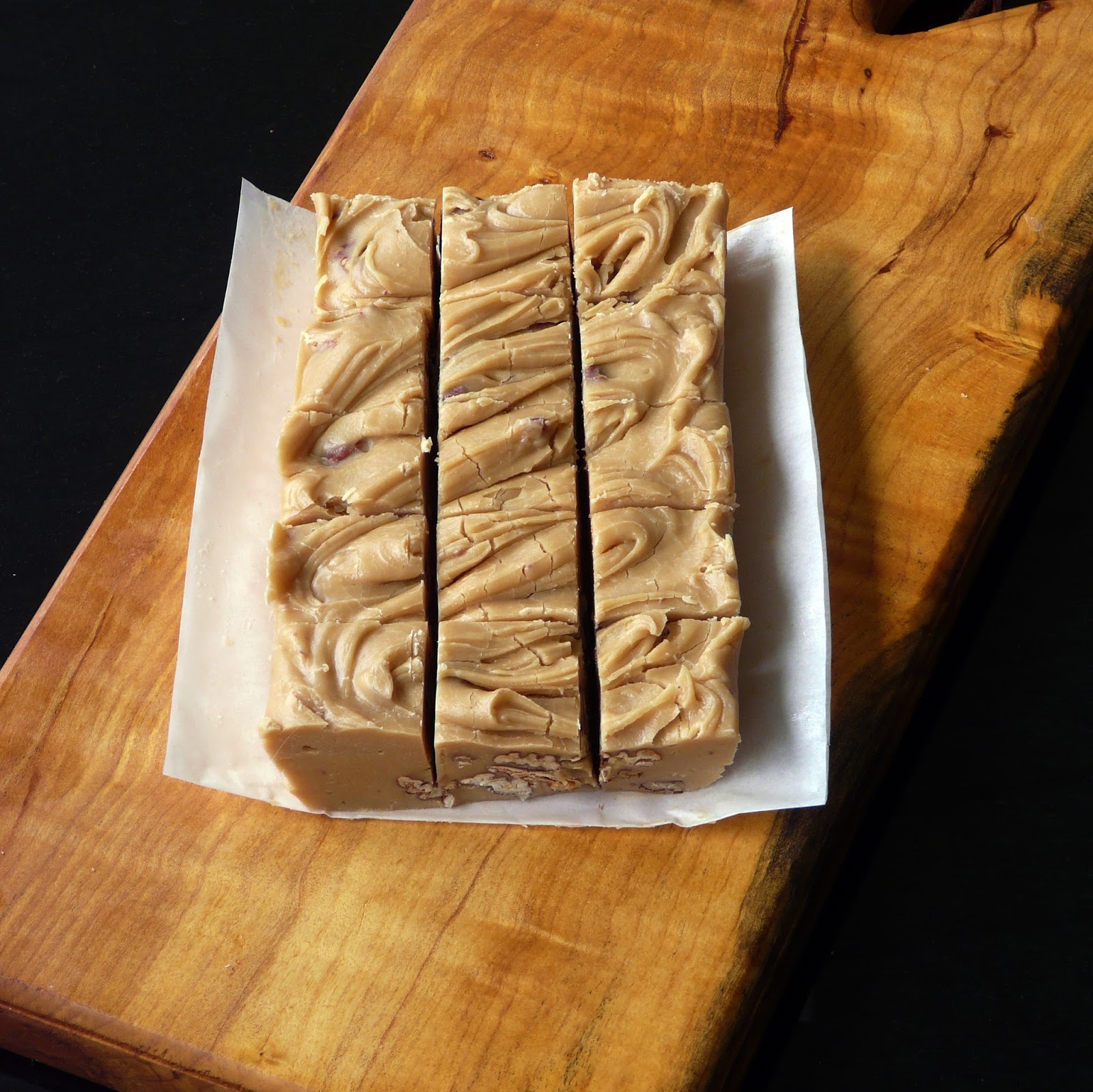 Add the two sugars, butter and cream maple syrup and salt into a sauce pan. Place over medium heat. Stir while bringing to a boil. Lower the heat and continue to stir slowly while the mixture cooks. After about 7 minutes, test by pouring a small amount into some cold water. You want it to form a soft ball. You might need to cook it for another minute or two. Remove from the heat, add a couple of teaspoons of vanilla and start stirring. It takes about 14 or 15 minutes for the fudge to cool and thicken. Pour into buttered dish.