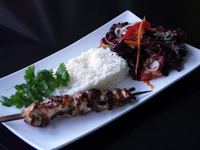 Skewers of chicken with green onions.