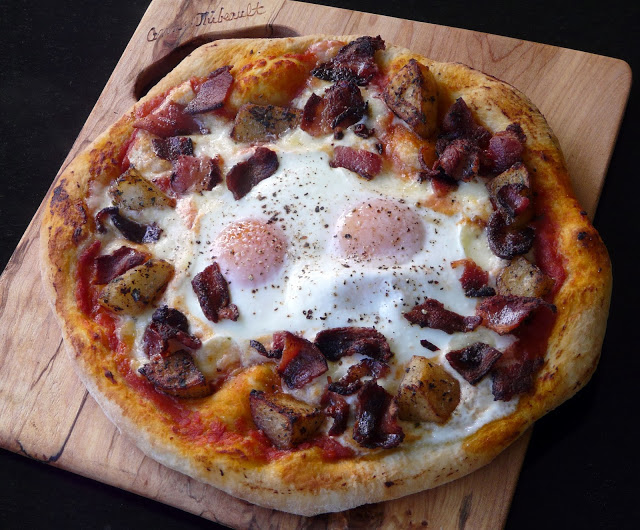 topped with fresh mozzarella, fried potatoes, bacon and eggs.