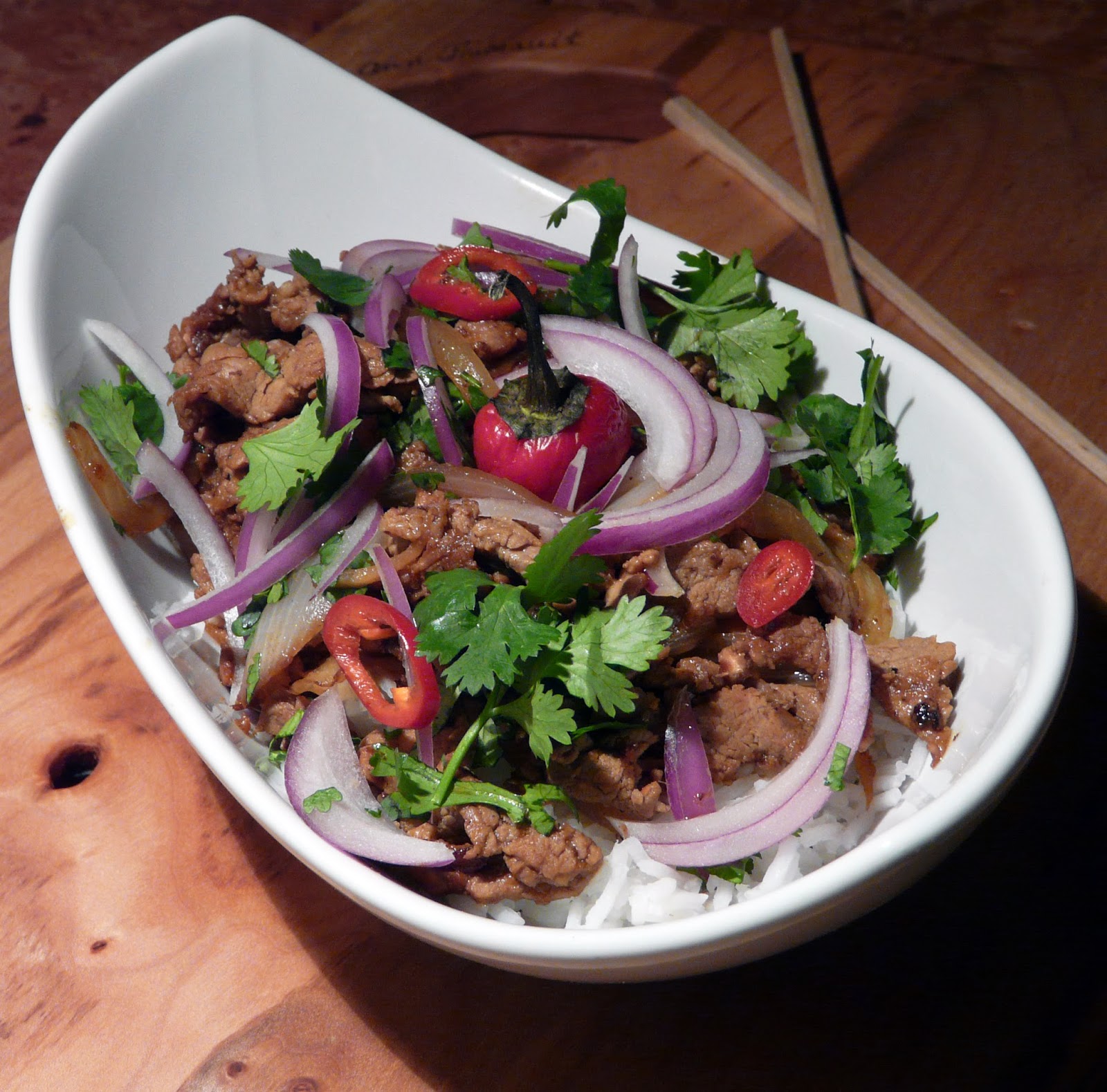 Heat a shallow cast iron skillet. When the skillet is really hot, add a little oil and the meat and the onions, garlic and ginger. If the pan isn’t big, cook the meat in batches. You want the meat to brown, not steam. Cook, over high heat until the meat starts to brown, turning a few times. Add the chile pepper slices. Add just a little chicken broth, stir well and serve over rice. Top with sliced red onion and chopped cilantro.