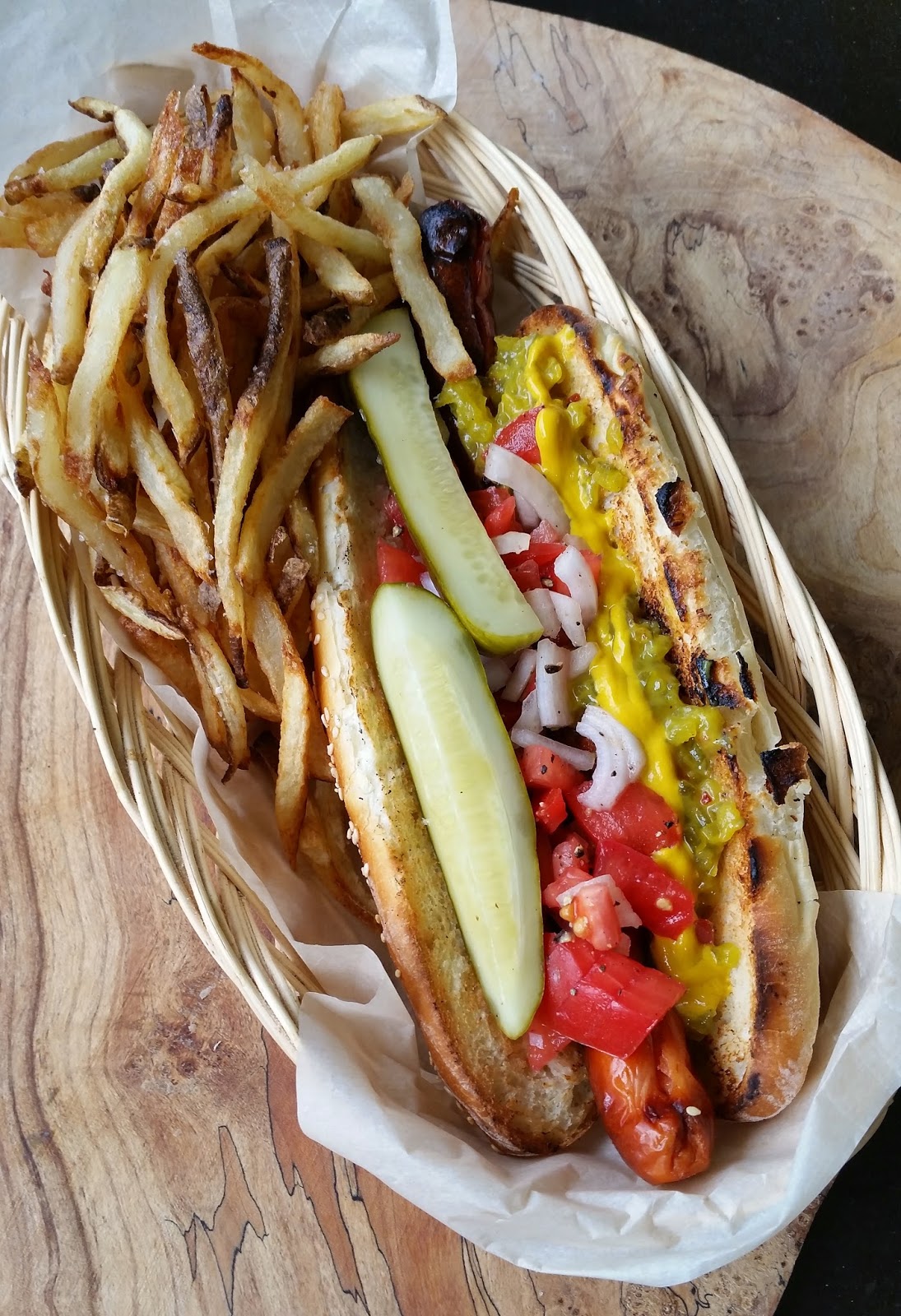 mustard, hot dog relish, tomatoes, onions and dill pickles.