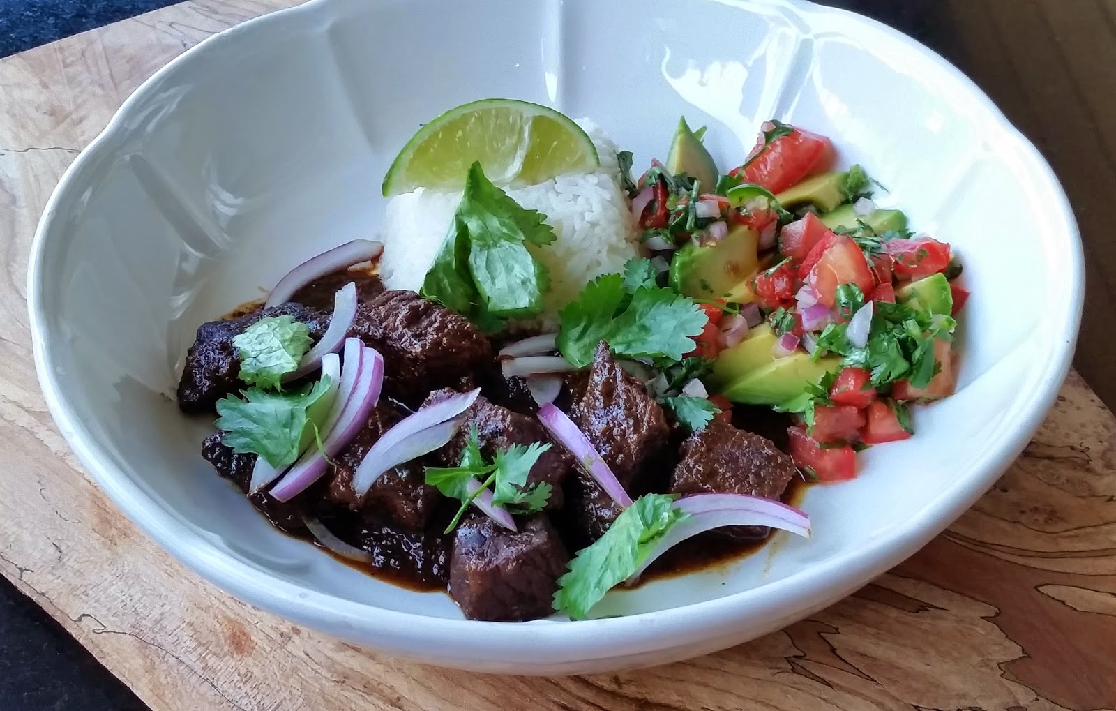 Carne Colorada, rice , avocado and fresh salsa.