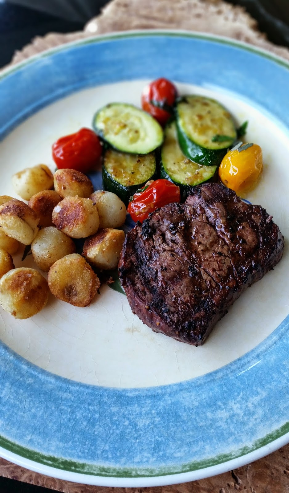 Filet Mignon with Parisienne potatoes, and zucchini and cherry tomatoes.