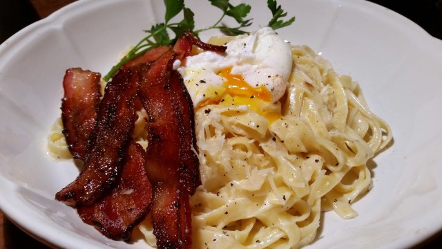 Fettuccine Alfredo with Bacon and Poached Egg.