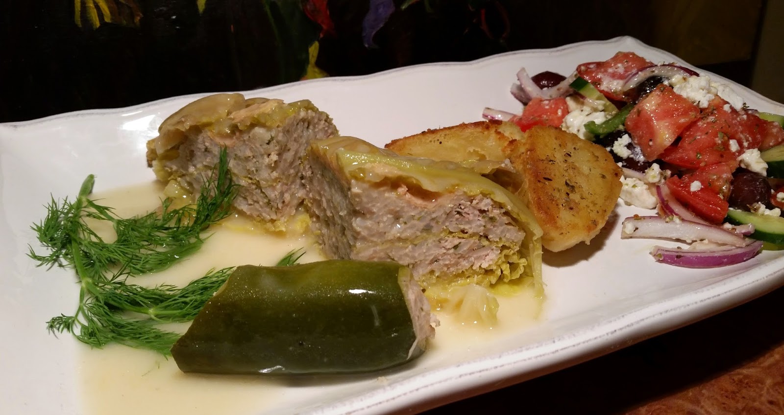 Filled with a rice and pork filling seasoned with lemon and dill.