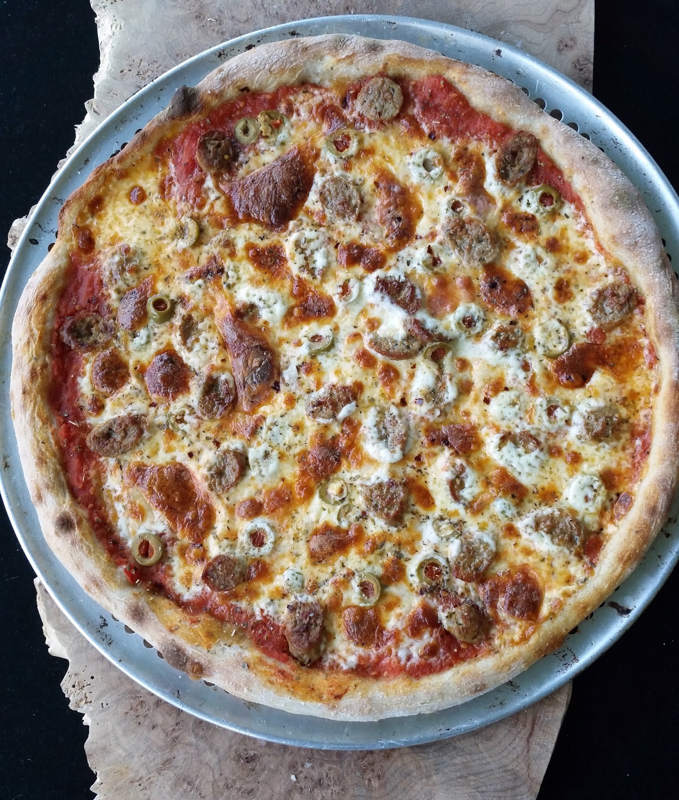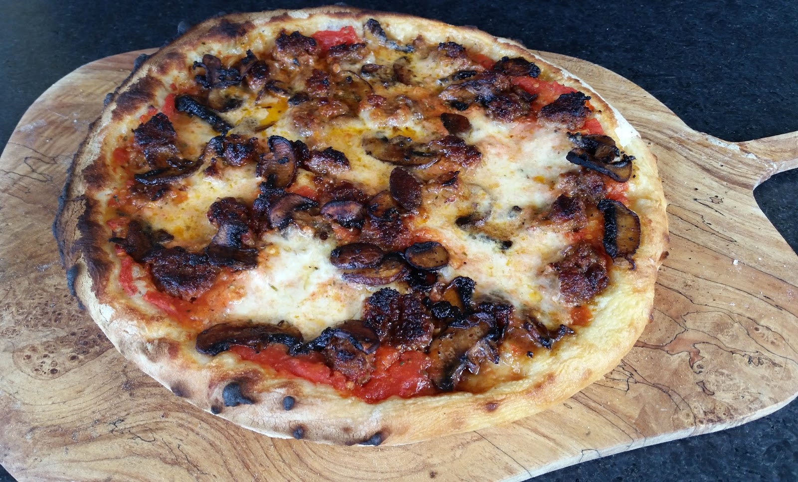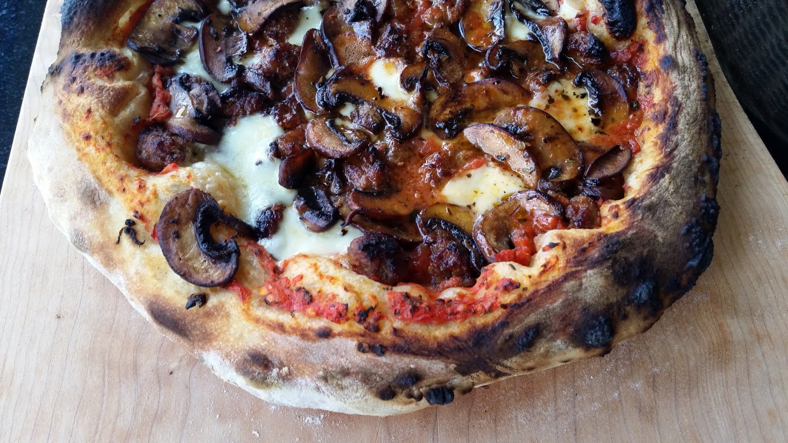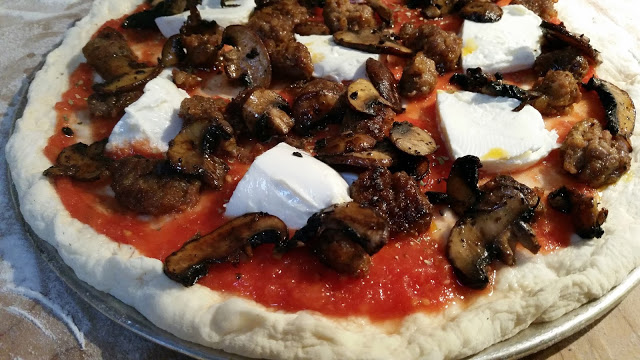 Pizza dressed with sausage and musrhooms with fresh mozzarella cheese.