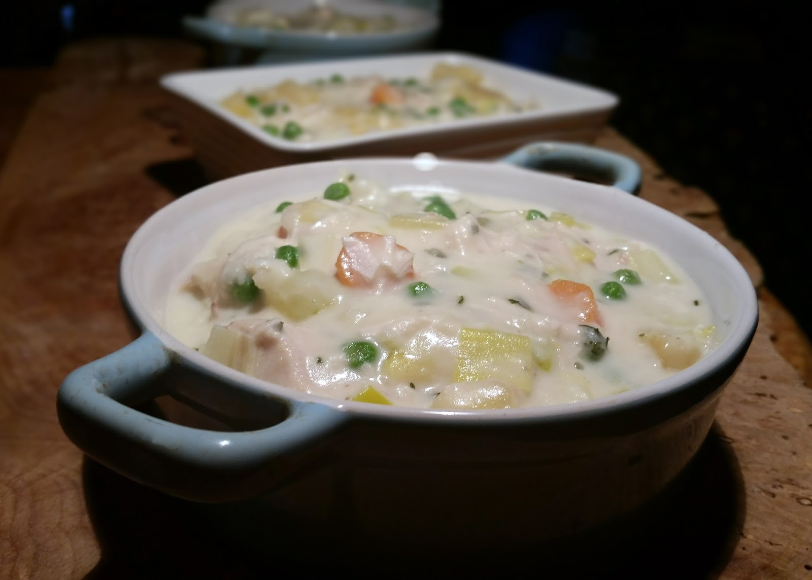 vegetables and chicken to the sauce. Add frozen peas. Season with