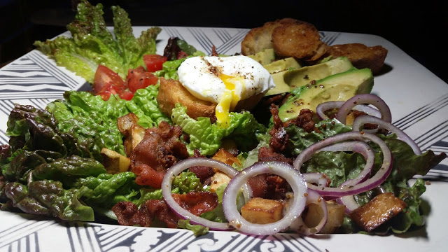 Breakfast Salad with fried potatoes, bacon, onions, tomatoes,