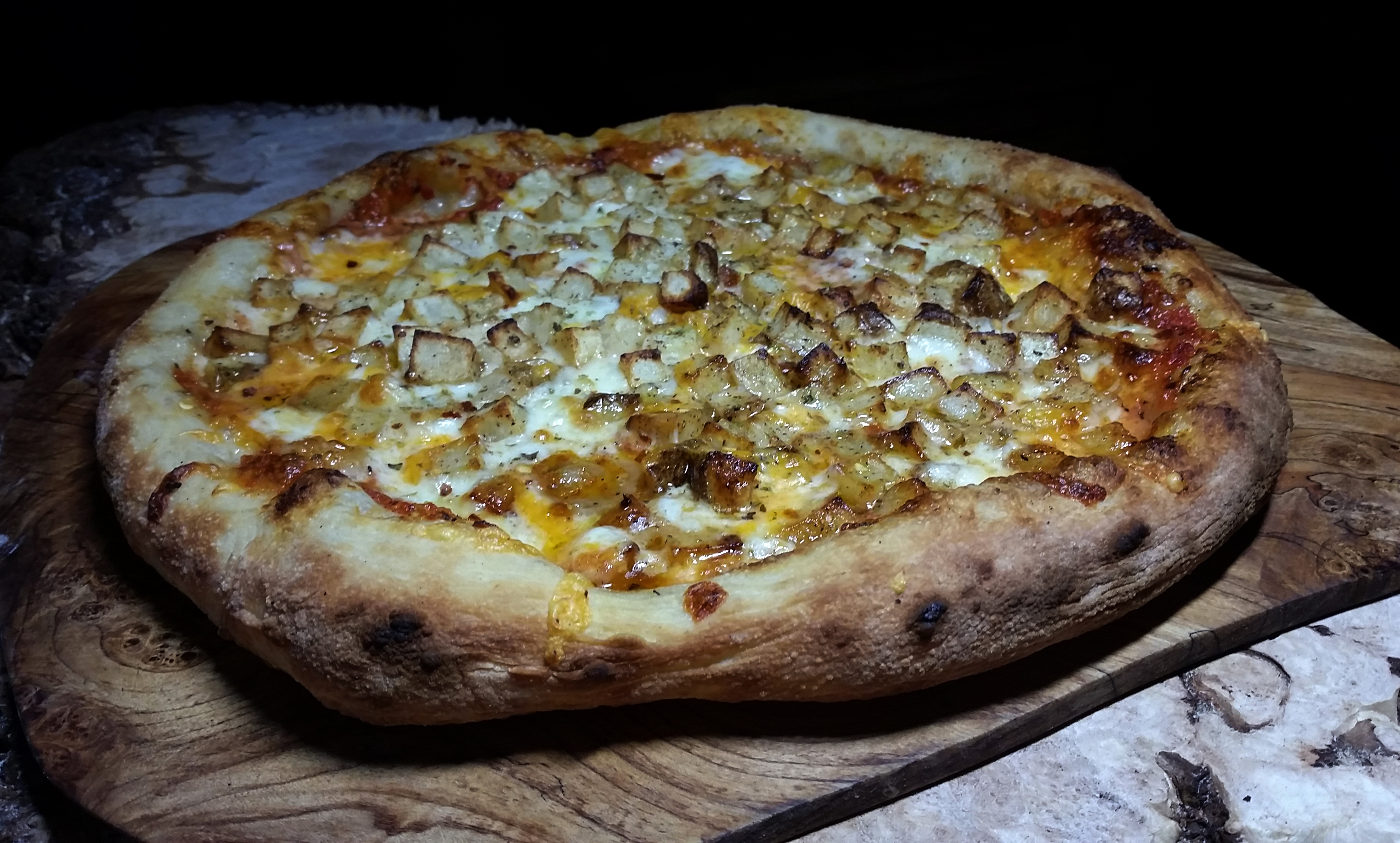 (Frying works well too. Fry the cubes or slices. Remove from oil, toss with one or two minced garlic cloves, season with salt, pepper and oregano and squeeze a lemon over the potatoes. Toss and scatter over pizza)