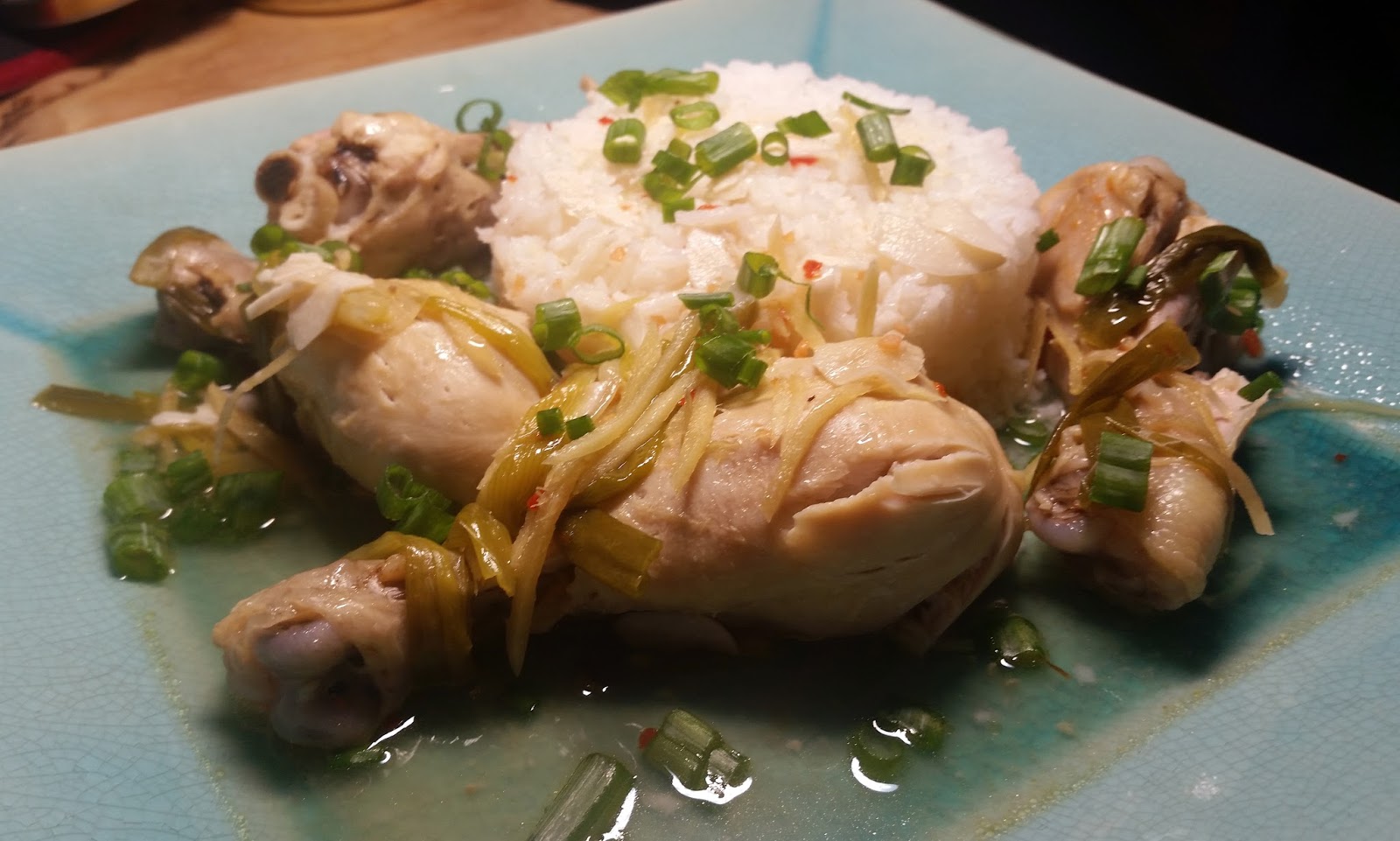 lots of julienned ginger, and the white part (3″ long) green onions.