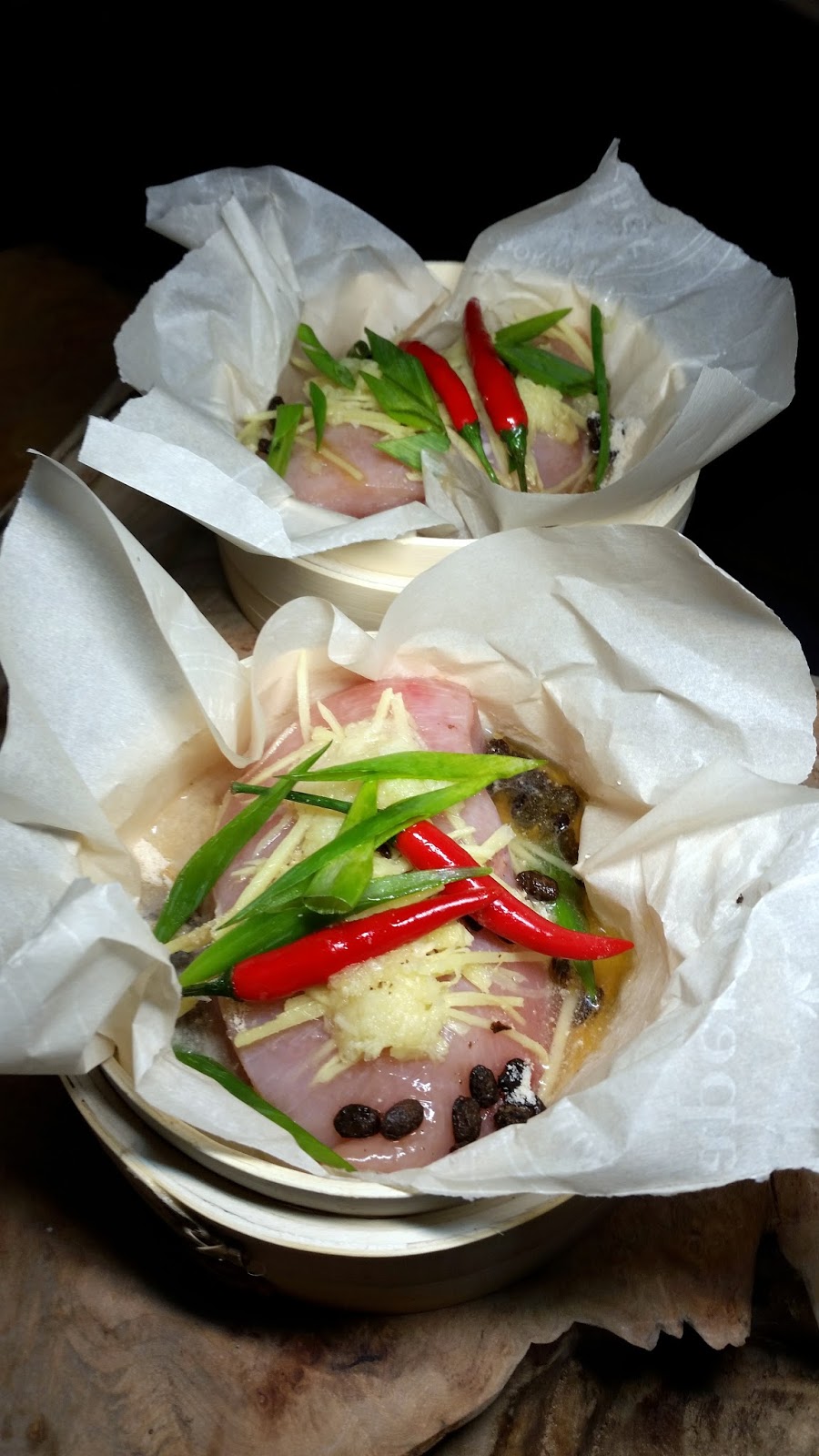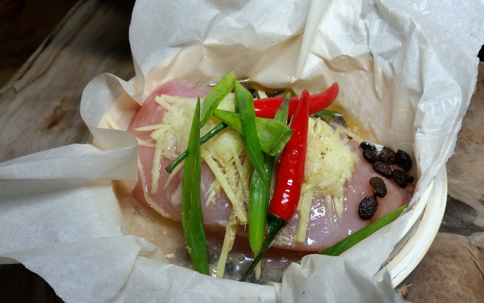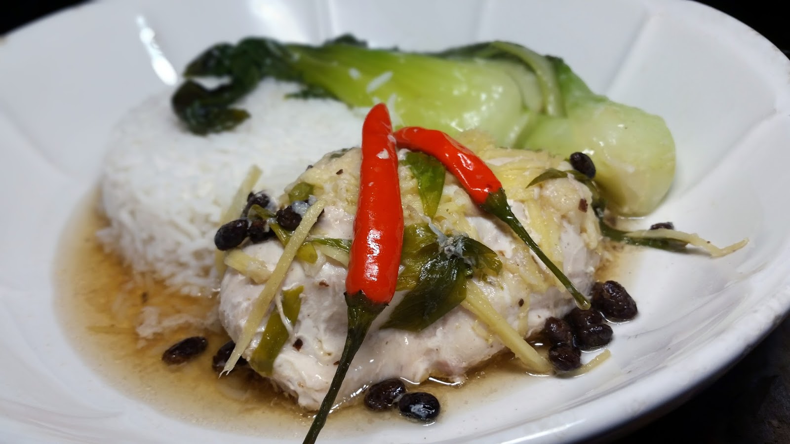 Chicken was seasoned with fresh garlic, ginger, drizzle of sesame oil, green onion and