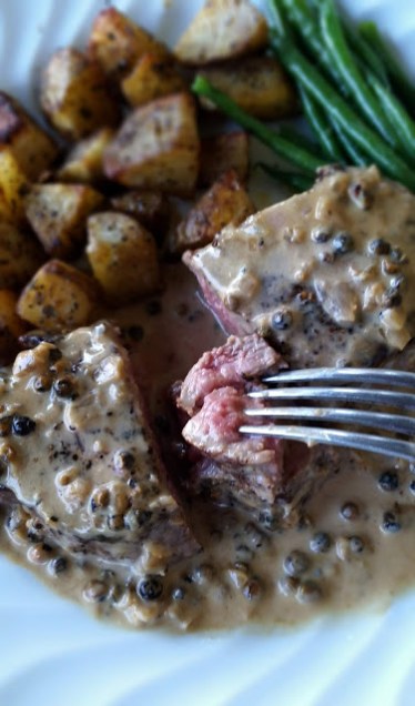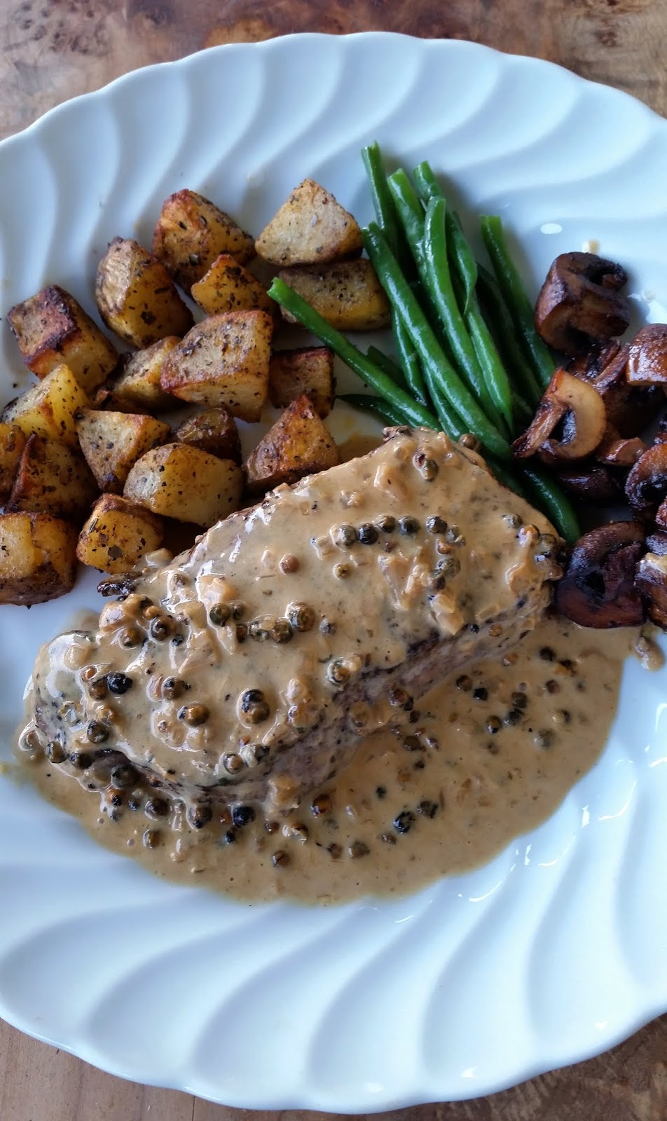 Green Peppercorn steak with roasted potatoes, sauted mushrooms and steamed green beans.