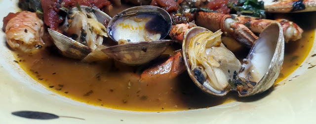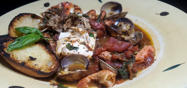local Spot Prawns, Clams and Halibut. With grilled, garlic olive oil brushed baguette.