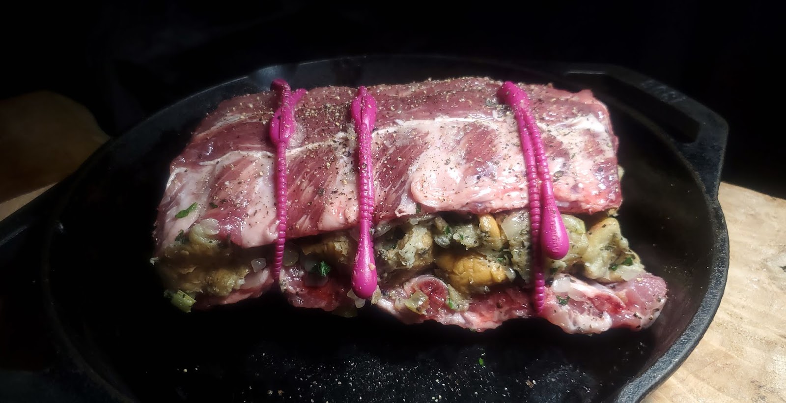 Spread stuffing over one of the racks and top with the second one. Tie together using butcher twine or silicone ties. Place in shallow roasting pan, rub or drizzle with a little olive oil, toss in a few