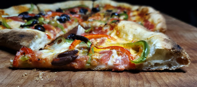 Topped with sliced tomatoes, green and red peppers and green and black olives.