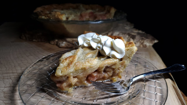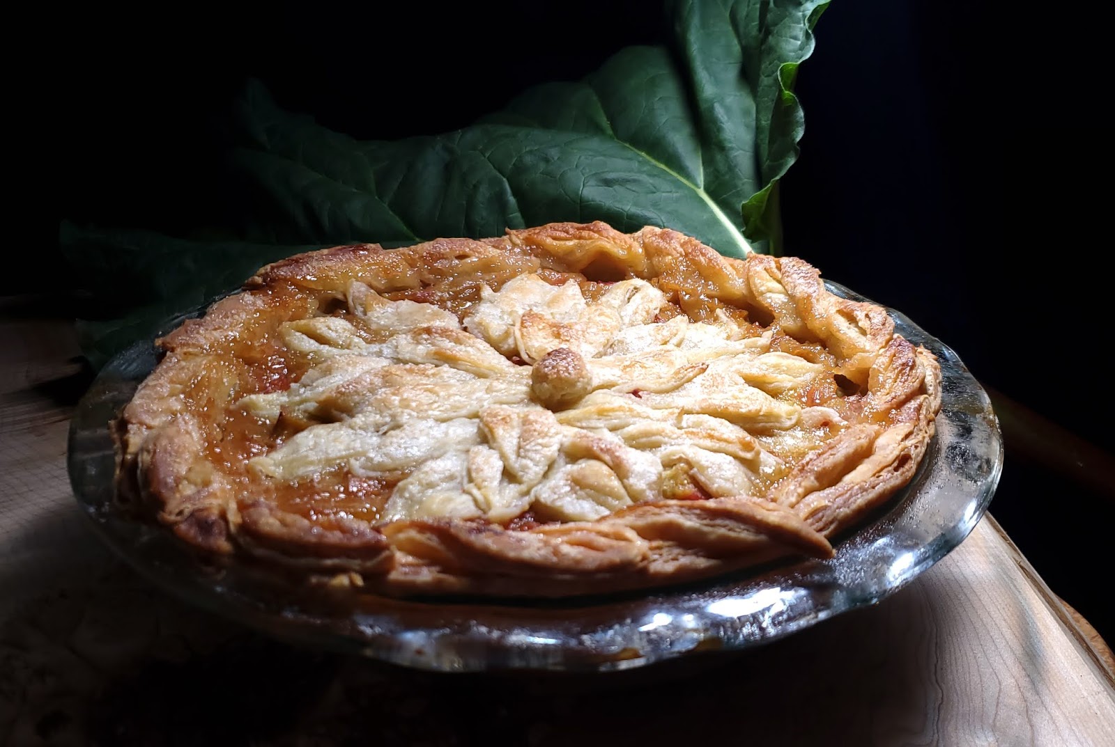 Roll out dough for bottom crust and line pie plate with pastry. Beat eggs lightly, and then stir in brown and white sugars, flour, lemon juice, salt and extract. Mix in rhubarb.