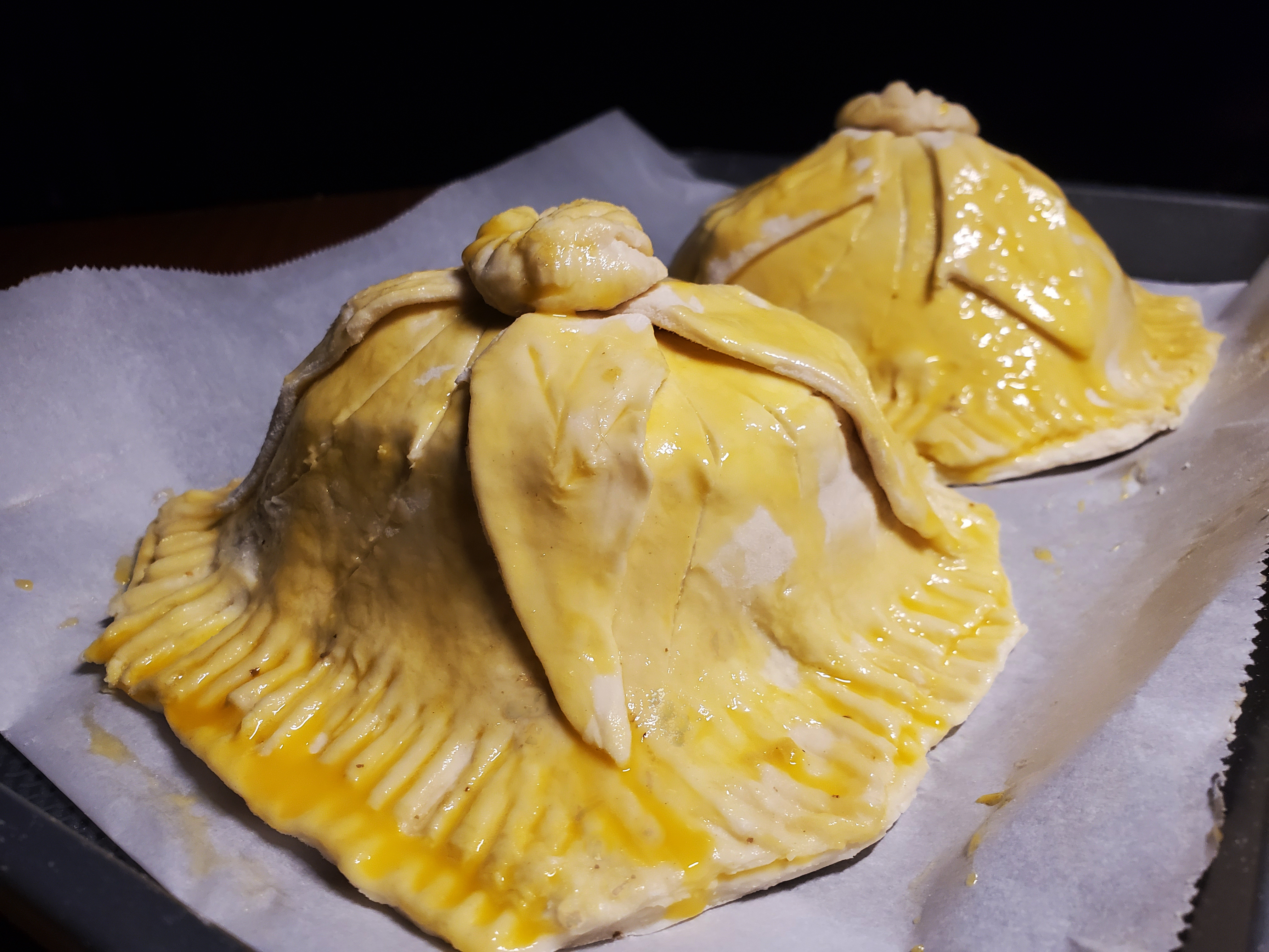 Roll out puff pastry. Rather than a square I made a longer rectangle. Spread mushroom duxelle on the bottom third of the pastry. Top with beef and if you have more duxelle place on top. Brush edges with egg wash. Fold the remaining pastry over steaks and seal edges. Cut off corners of excess pastry on three sides to form almost a round, and using a fork press to seal. Roll out leftover bits of pastry and cut out decorations. Brush with egg wash. Can be made up to this point and refrigerated until ready to bake. Bake in a 425 to 450°F oven (middle rack) until pastry is golden brown. About 20 minutes. You don’t want to over cook. Beef should be rare to medium rare. I tested with a digital thermometer at 20 minutes and the meat registered 118°F. Pastry was cook so I removed it from the oven and let it rest while I finished the sides. Temperature rose to 123°F.