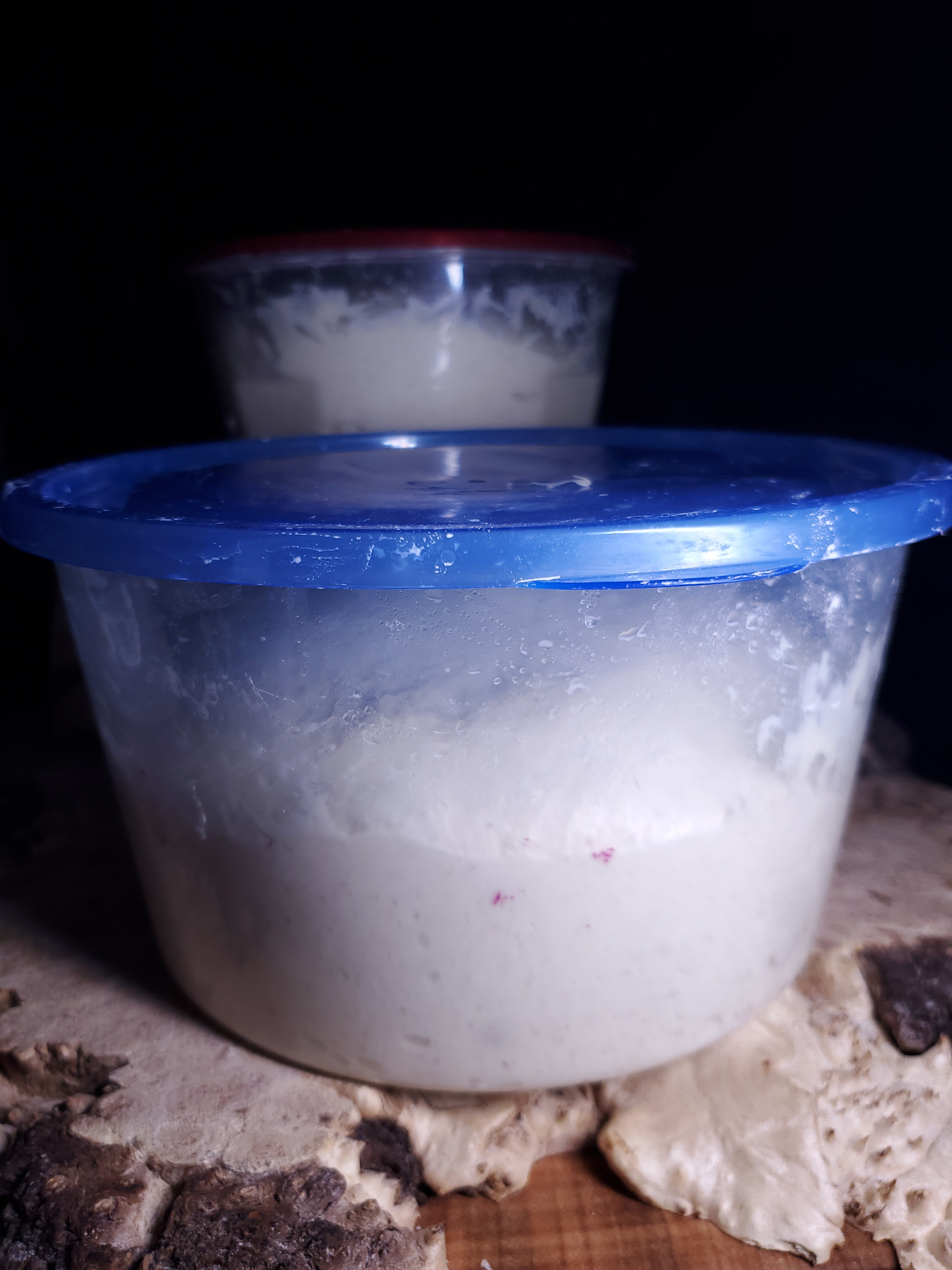 I fed both starters again Monday and then Monday night I made two more batches of dough. Both with 500g of flour, 72% hydration, 50g of discard starter, and 1 gr of yeast. 16g of salt. Finished the last stretch and fold just before 9:00 and left them both out on the counter to rise overnight.