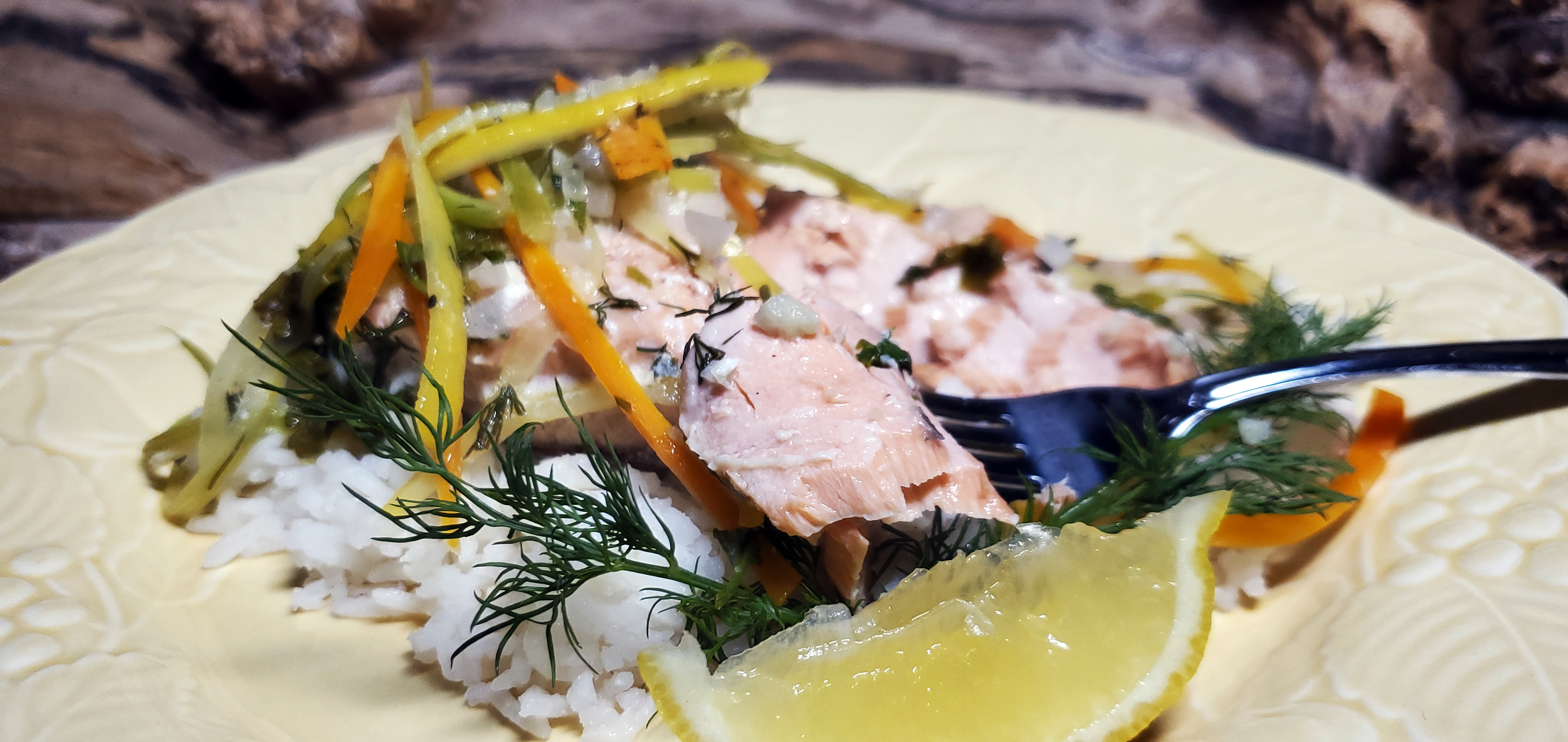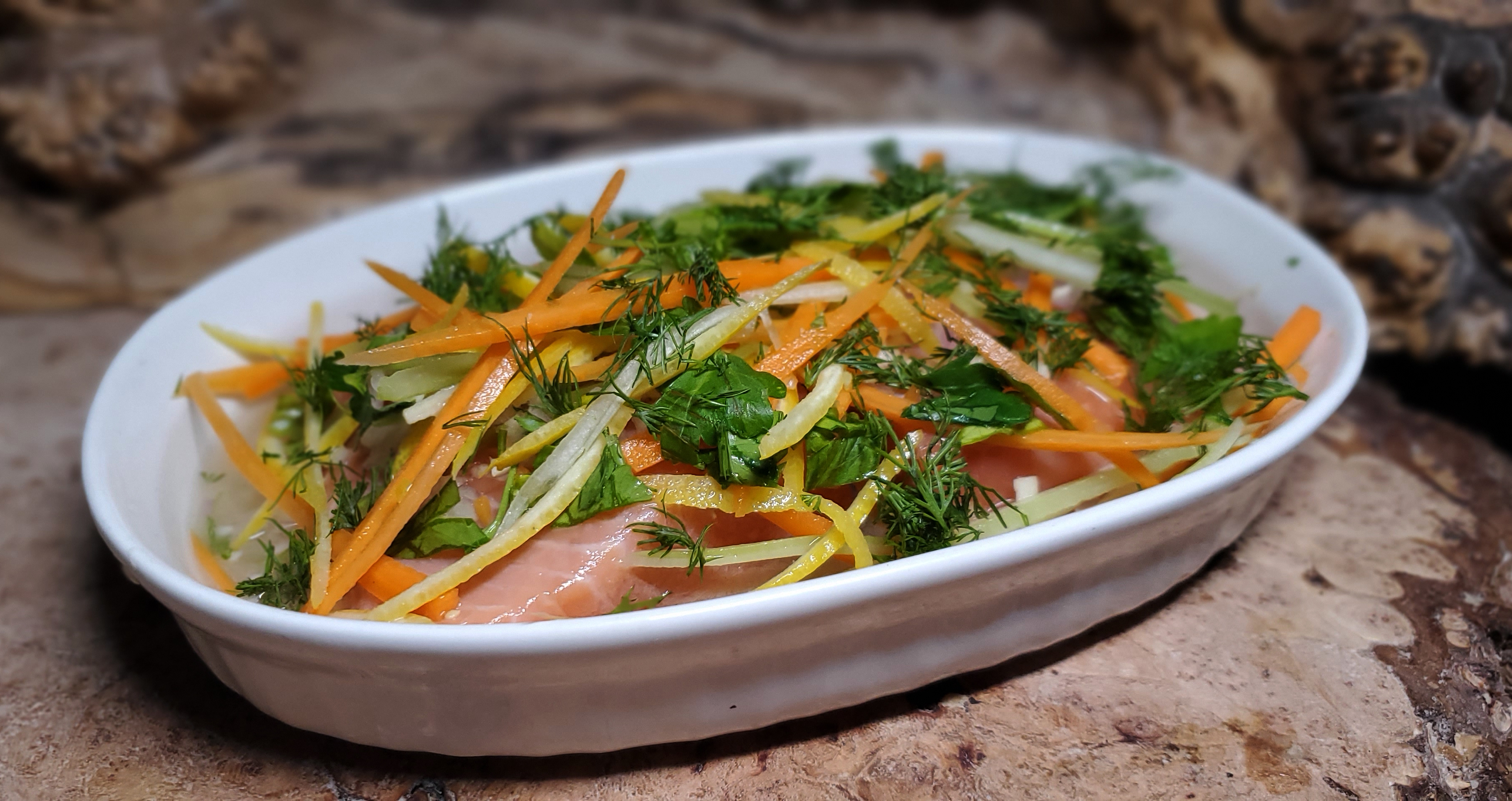 BC Wild Spring Salmon.This is a recipe I have been making for over 40 years.Adapted from an Umberto Menghi recipe. Salmon topped with Julienned vegetables and baked in the oven.